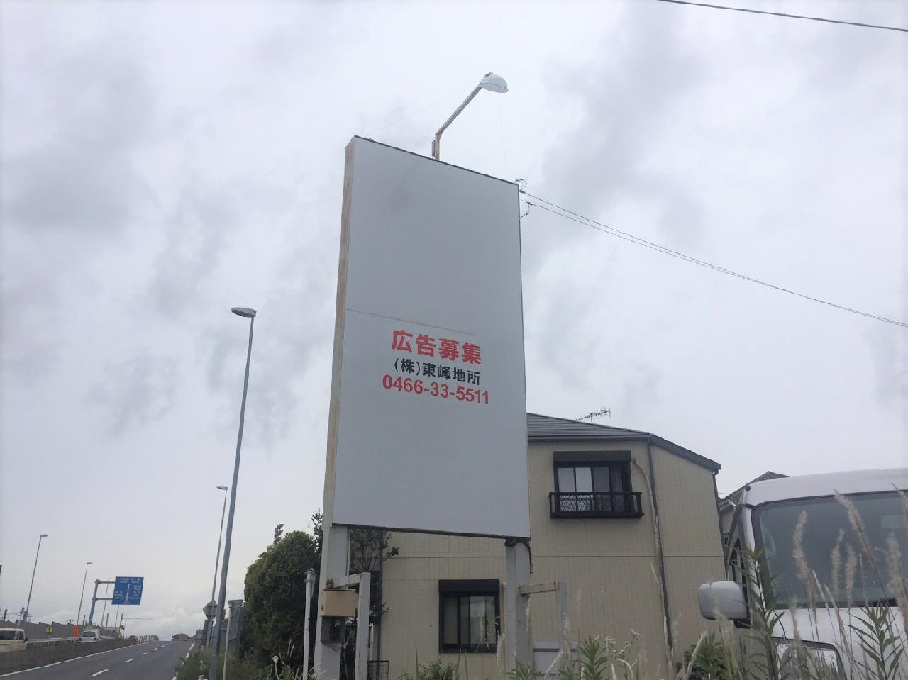 野立て自立看板の片面を白く上貼りして、次の広告主様を募集するためのシートを貼っています。